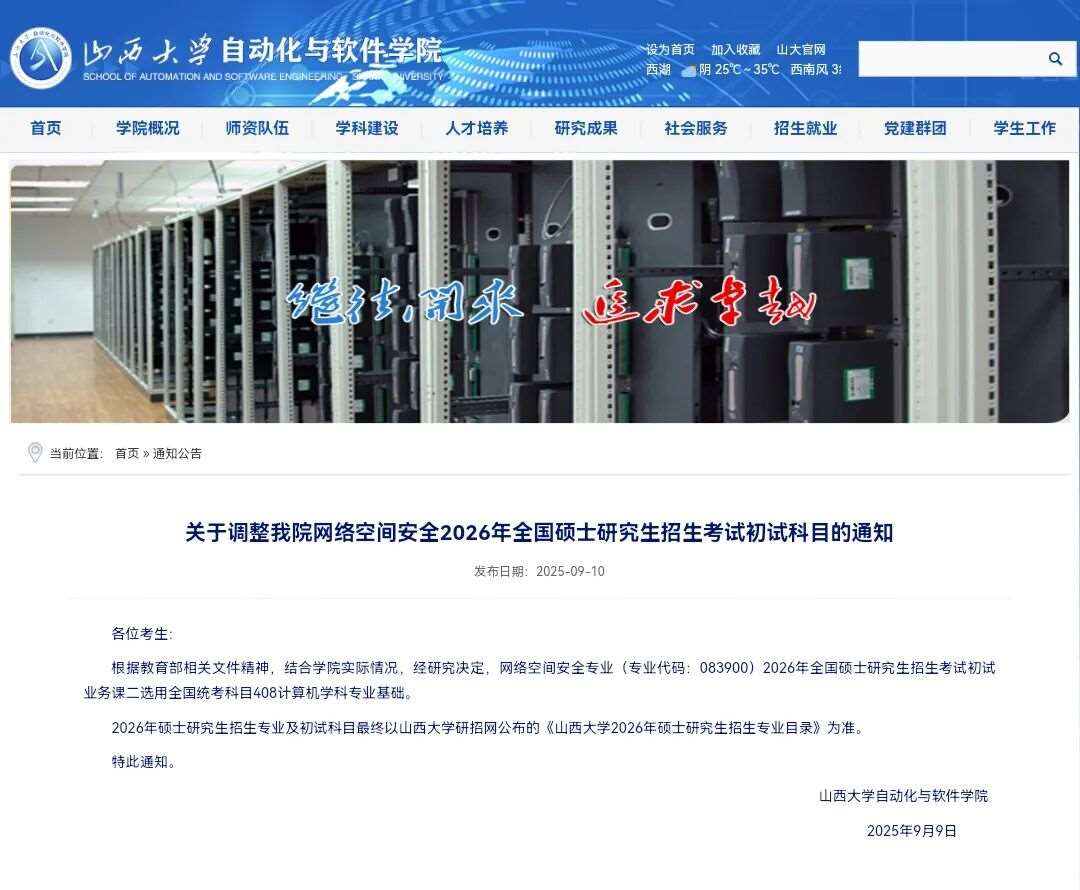 山西大学自动化与软件学院网络空间安全官宣26考研改考408。