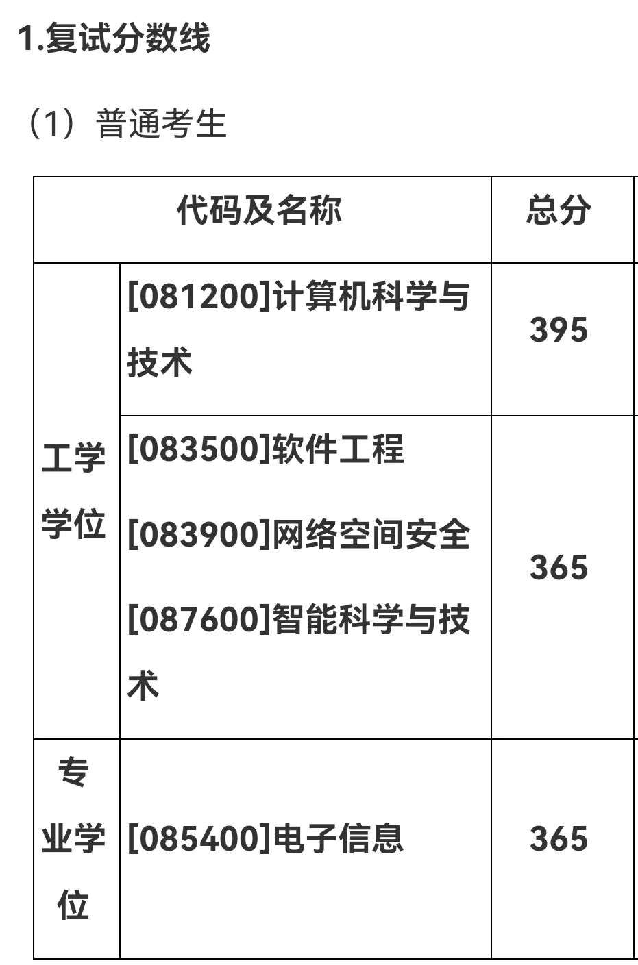 与此同时,网络空间安全(083900)、电子信息专硕(085400)复试线也双双达到365分,较往年大幅上扬。软件工程(083500)和智能科学与技术(087600)官方暂未公布具体分数线,但据内部消息与报考热度推断,最终划线极大概率也在360~380区间内,考生须严阵以待!